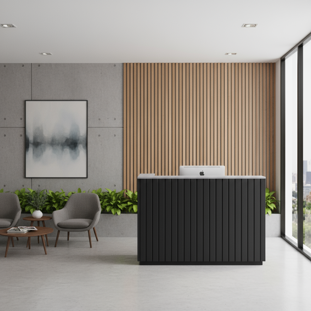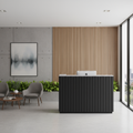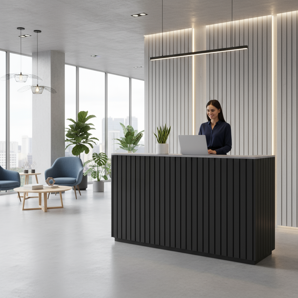 Modern reception table with minimalist design, beige and white finish, and integrated lighting strip.